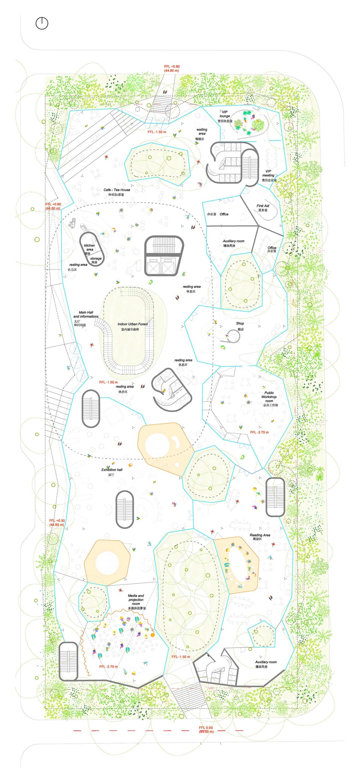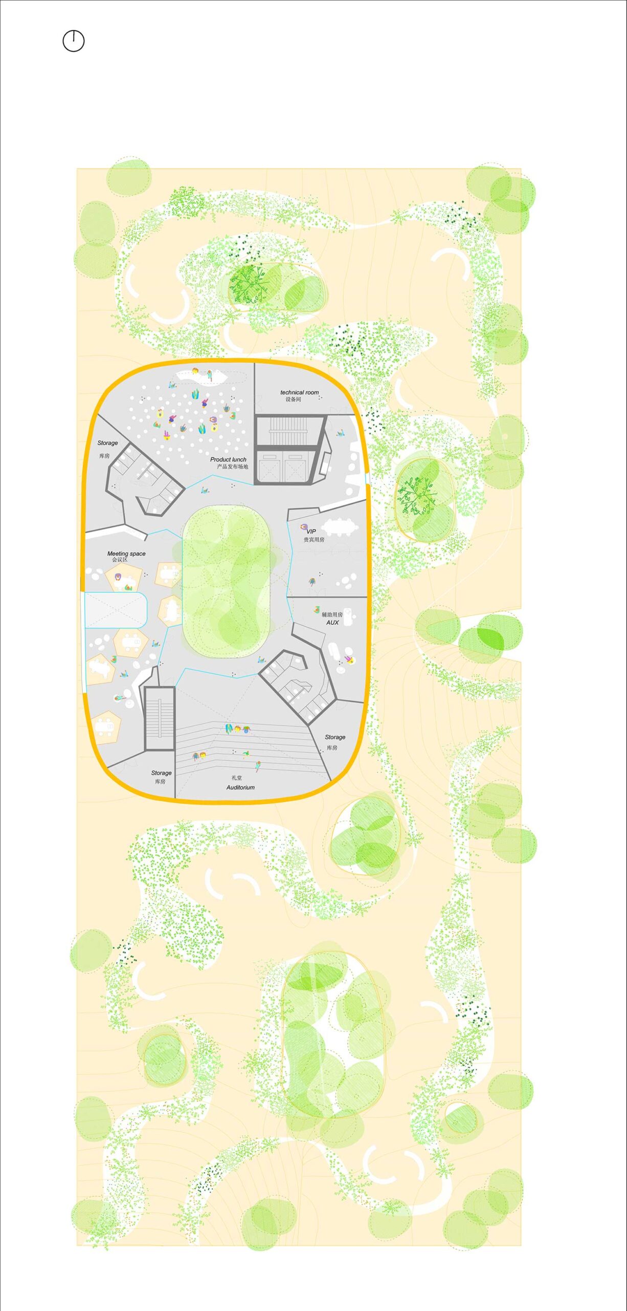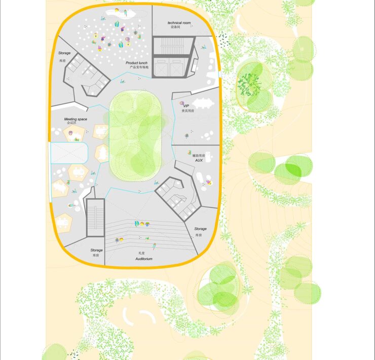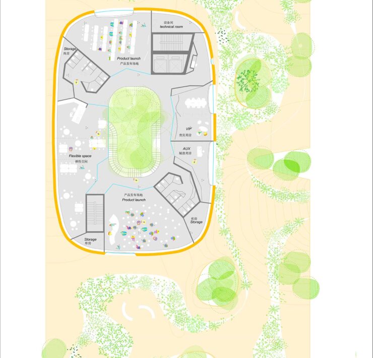 Attorno, sono previsti spazi di conversazione, socializzazione e di servizio che punteggiano uno spazio per la più parte aperto e flessibile, con arredi e partizioni mobili, adattabili a una quantità di attività diverse e a possibili usi futuri ancora non previsti o immaginati. Arredi e partizioni i cui materiali, rivestimenti e decorazioni sono pensati per riflettere la ricchezza culturale della città di Pechino.
