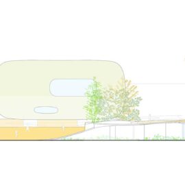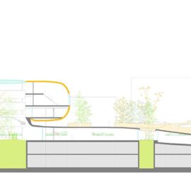 Al di sopra di questo vasto spazio espositivo e dei due livelli sotterranei, previsti per gli ambienti di servizio e per i parcheggi, sorgerà la piazza pubblica: un nuovo paesaggio artificiale dove natura e costruito, verde e minerale si incontrano senza soluzione di continuità e dialogano con le forme organiche dei livelli superiori, il volume più piccolo, alto tre piani e destinato a ospitare gli spazi più privati del centro espositivo.