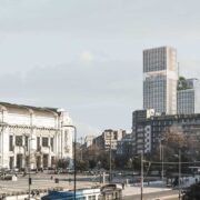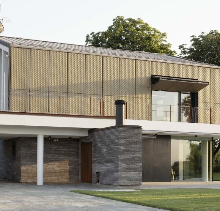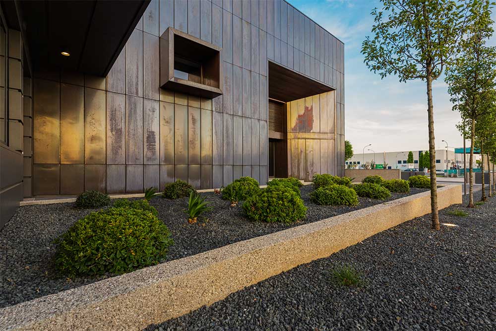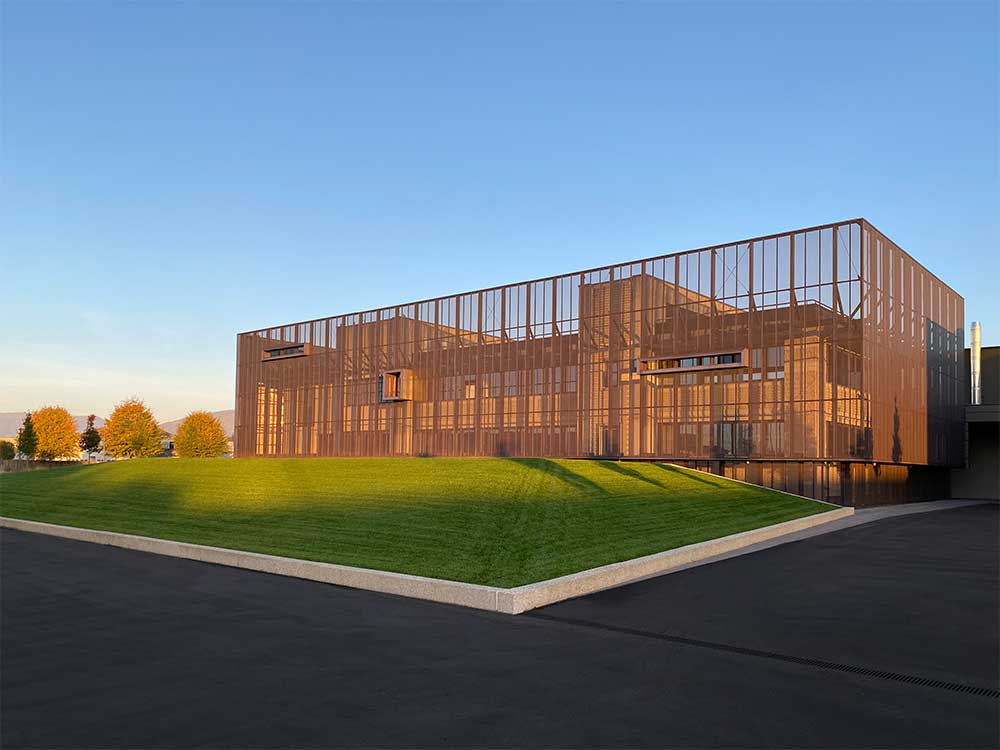 Il rame preossidato del nuovo involucro, commercializzato da Alpewa (TECU OXID spessore 8/10 mm, utilizzato sia in lastra cieca per la facciata ovest dell’ingresso sia preforato con foratura Ø 7 mm e passo 10 mm) è un materiale vivo, che muta in modo omogeneo in relazione agli agenti atmosferici e genera atteggiamenti, colori e riflessi sempre diversi ad ogni ora del giorno. La sua duttilità permette inoltre di creare superfici omogenee ma al contempo materiche simulando una tessitura impensabile da ottenere con materiali alternativi.