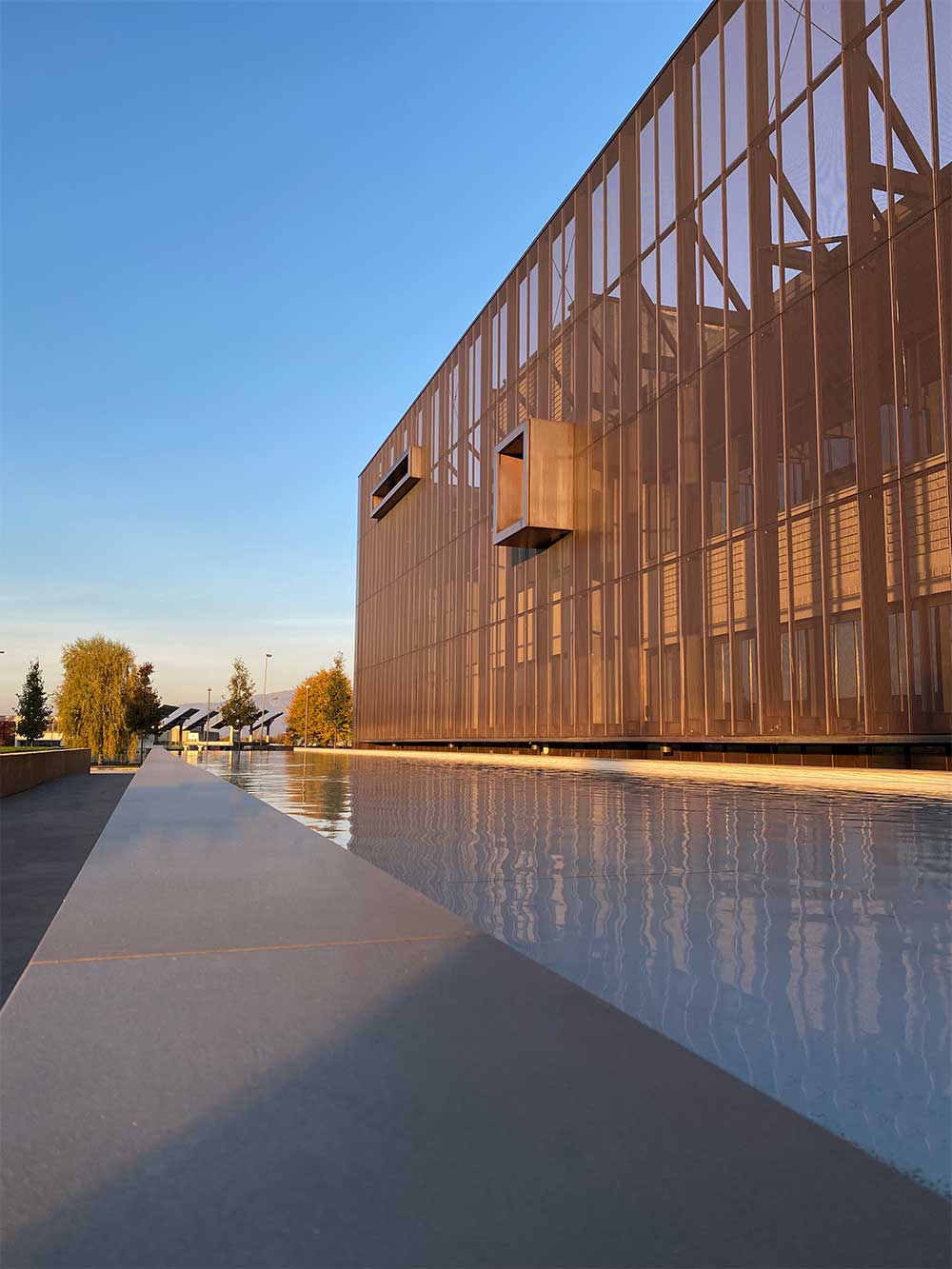 Due i temi progettuali che hanno guidato l’intervento: da un lato la semitrasparenza della lamiera di rame forata che cela l’edificio preesistente e permette il passaggio di luce e aria; dall’altro il verde e l’acqua, realizzando lungo il fronte principale, dove affacciano tutti gli uffici, un parterre a verde rastremato che culmina in uno specchio d’acqua, creando un dialogo con l’esterno che favorisce il benessere degli ambienti di lavoro.