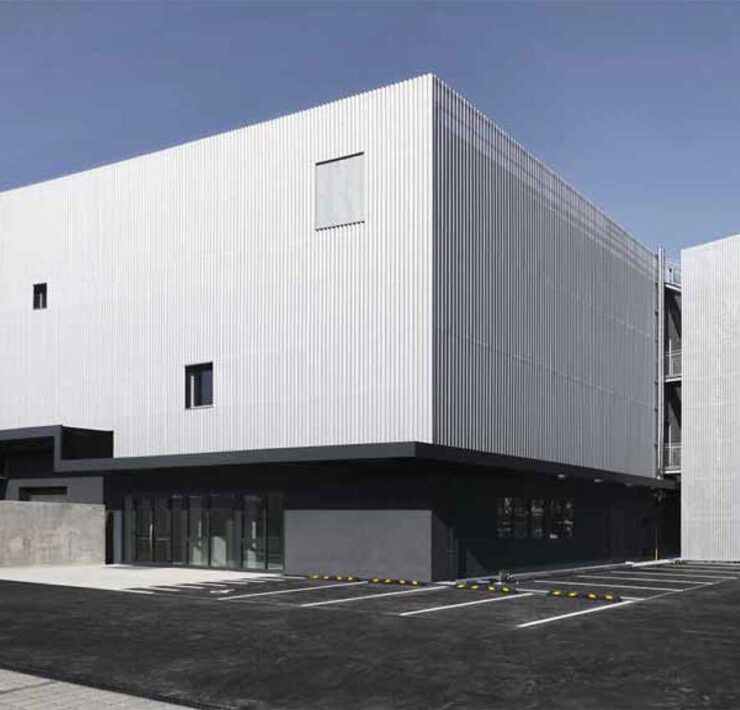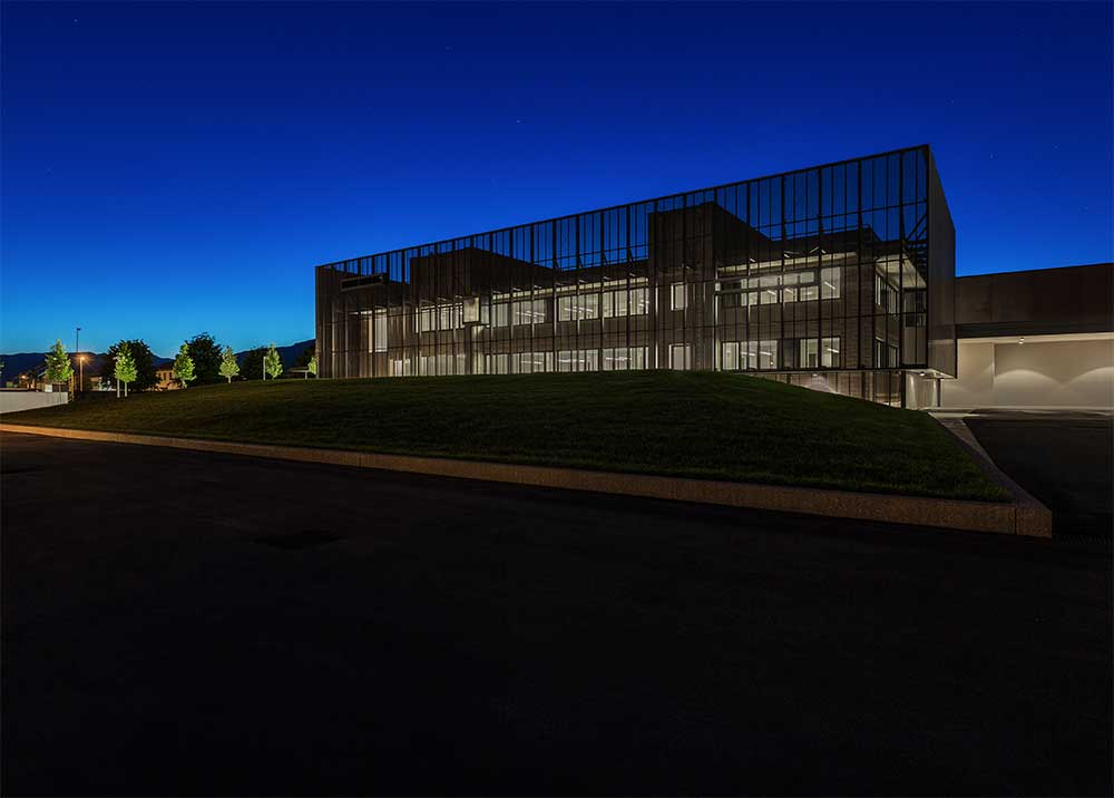 A sua volta la tessitura forata, che non impedisce la vista verso l’esterno, crea protezione e privacy verso l’interno e la sera trasforma l’edificio in una lanterna illuminata sulla zona industriale.