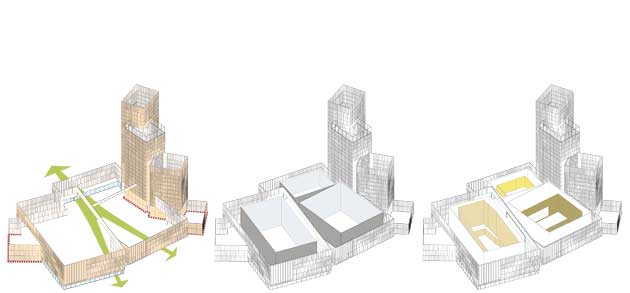 | La facade layer cake mostra le tre aree destinate a sala concerti, centro conferenze e spazio d´uso flessibile |