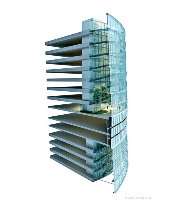 Seguendo linee progettuali innovative, il grattacielo racchiude tra le facciate a doppia pelle nove ampi spazi verdi multipiano che creano una nuova forma di relazione tra indoor e outdoor e un senso di comunità per gli occupanti. Le lobby verdi – ragione decisiva per l’assegnazione del premio – introducono alle diverse funzioni ospitate nell’edificio, che si configura così come una vera e propria città verticale: negozi, alberghi, ristorazione, uffici.