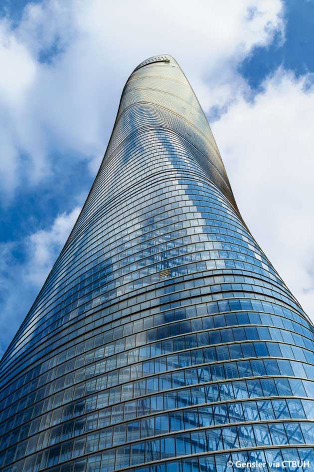 La Shanghai Tower, che con le vicine Jin Mao Tower e Shanghai World Financial Center di Kohn Pedersen Fox definisce lo skyline della città, si eleva per 632 metri dal suolo (a 561 metri la massima altezza abitabile, attualmente è il secondo grattacielo più alto del mondo e il primo in Cina) con un profilo arrotondato e una torsione che test di laboratorio hanno dimostrato ridurre del 24% l’impatto del vento.