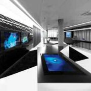 Il progetto risponde a questa esigenza di flessibilità con due grandi spazi a piano terra, di forma circolare e concentrica: la redazione nord (1.000 mq) e la redazione sud (1.300 mq). Il gran numero di schermi, video interattivi e pannelli collegati a tutti i canali informativi, le linee avvolgenti e la trasparenza fanno pensare alla sala comando dell’Enterprise. Un richiamo che prosegue con i phone boot gialli insonorizzati collocati agli angoli, che ricordano le cabine del teletrasporto dell’astronave di Star Trek.