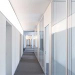 L’edificio, un parallelepipedo chiuso su tre lati, si apre invece con una facciata interamente vetrata verso nord, con viste sull’incantevole paesaggio verde dell’intorno. L’orientamento a nord favorisce tra l’altro l’ingresso della luce naturale senza per questo dover ricorrere a schermi protettivi dal momento che l’irradiazione solare diretta è quasi del tutto assente.