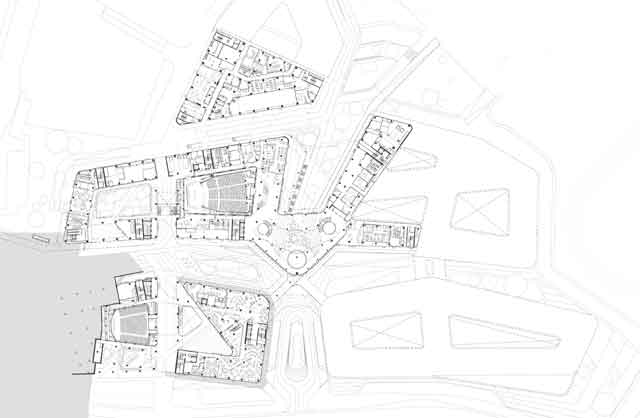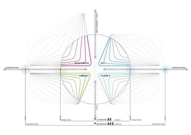 Come evidenziato nel masterplan, il complesso si basa sul concetto di “rete” ed è definito da due assi principali che si intersecano in un nodo centrale che connette tutti gli ambiti della cittadella universitaria. Il nodo centrale è stato pensato da UNStudio come uno spazio flessibile dedicato a mostre, eventi e interazione e costituisce il cuore intellettuale del campus e collega direttamente le sue principali aree programmatiche – auditorium, centro internazionale del design, biblioteca universitaria.