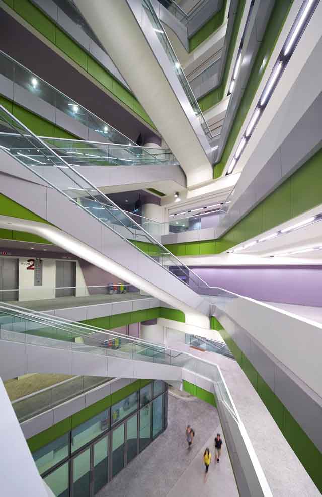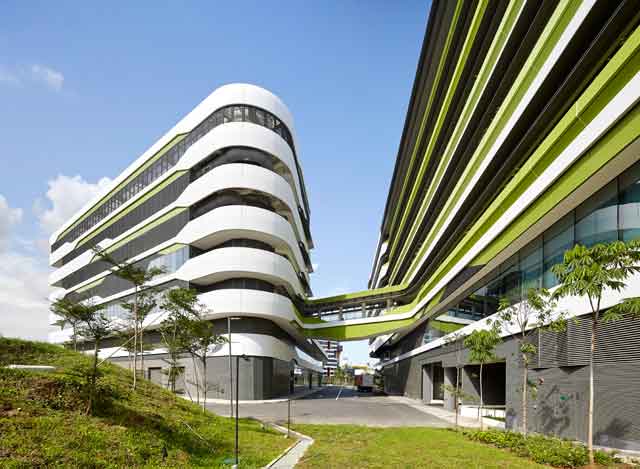 Il ricorso alla climatizzazione condizionata è ridotto grazie alla creazione di corridoi perimetrali ventilati naturalmente che definiscono una sporgenza schermante e minimizzano i carichi termici. Frangisole orizzontali sono stati appositamente progettati per ridurre l’apporto solare, riflettere e diffondere la luce naturale negli ambienti interni e, inoltre, proteggere i corridoi esterni dalle piogge tropicali. Il disegno complessivo cosituisce una risposta al paesaggio naturale di Singapore sia attraverso l´applicazione del colore che l´incorporazione di giardini pensili, facciate e tetti verdi e numerose aree verdi piantumate con essenze autoctone e fiorite.