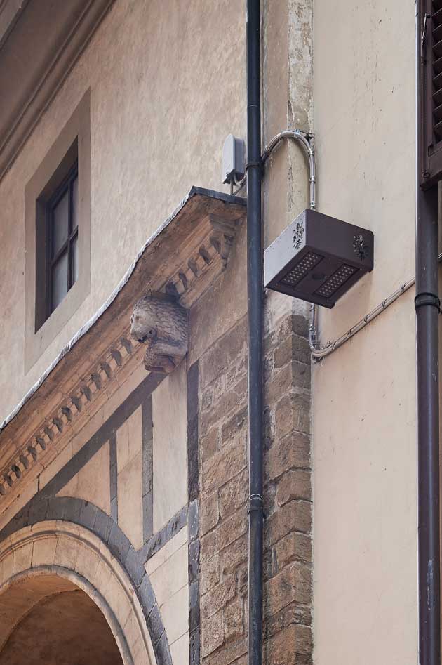 Sulle tre facciate della montatura dei dispositivi Square LED è stata realizzata una speciale personalizzazione raffigurante il giglio, simbolo della città di Firenze