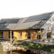 Il progetto della countryhouse combina materiali diversi in dialogo tra loro, tra design e tradizione: il cemento fa da base, il legno di colore scuro invecchiato in maniera naturale ricopre e riscalda le pareti, il tetto è in lamiera grigia.