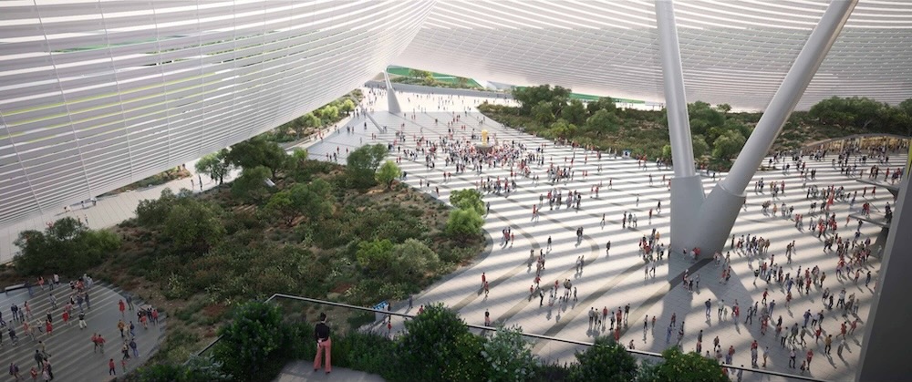 Lo stadio è coperto da un tetto realizzato in una particolare rete di alluminio. Un anello di 32 gradinate sostiene la geometria del tetto e del catino, creando ingressi monumentali punteggiati da giardini su piattaforme rialzate, a 28 metri dal suolo. Questi giardini sono un’oasi verde sotto l’involucro traslucido della copertura.