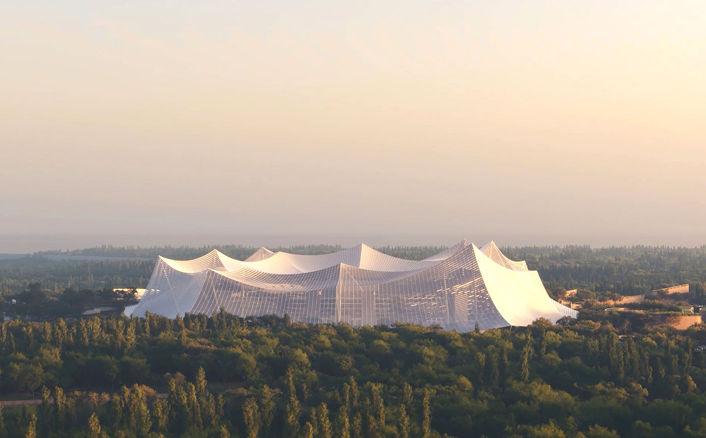 Lo stadio è coperto da un tetto realizzato in una particolare rete di alluminio. Un anello di 32 gradinate sostiene la geometria del tetto e del catino, creando ingressi monumentali punteggiati da giardini su piattaforme rialzate, a 28 metri dal suolo. Questi giardini sono un’oasi verde sotto l’involucro traslucido della copertura.