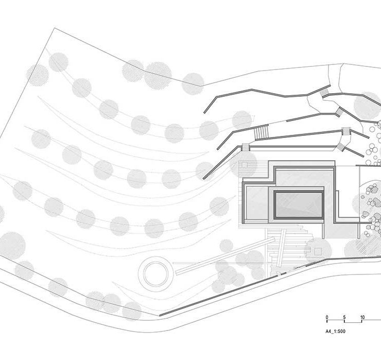 Il desiderio del cliente era quello di creare spazi semplici e puliti con il massimo uso di materiali naturali. All’esterno, blocchi di pietra a spacco sono usati per i recinti e i muri di sostegno dei terrazzamenti che compongono un paesaggio mosso e articolato.