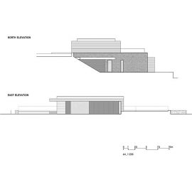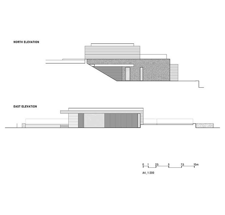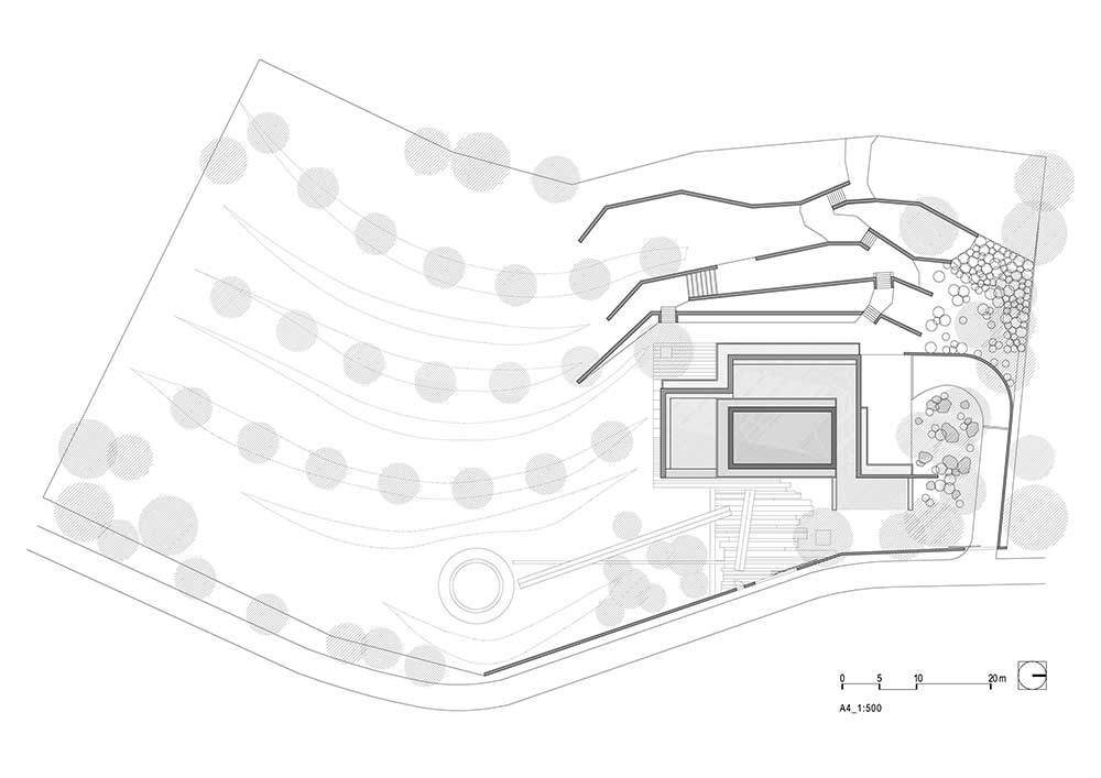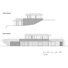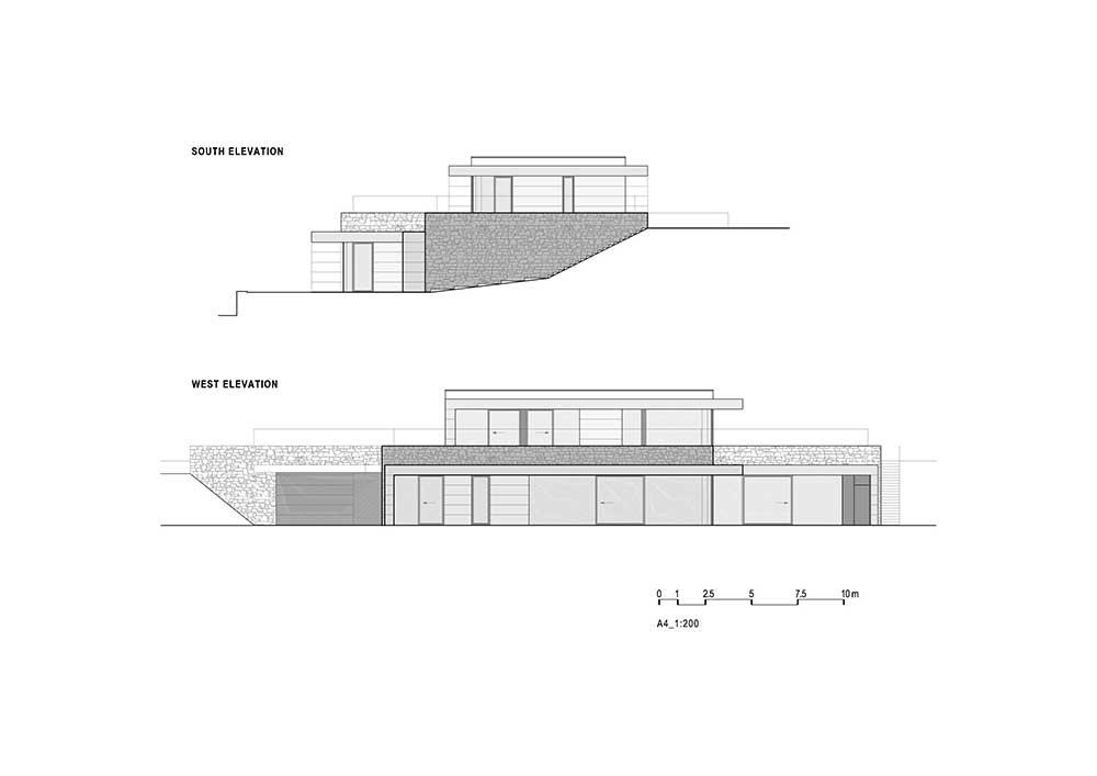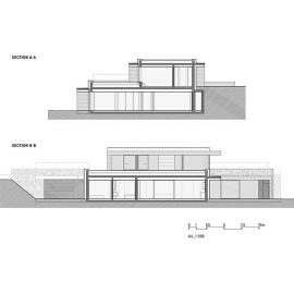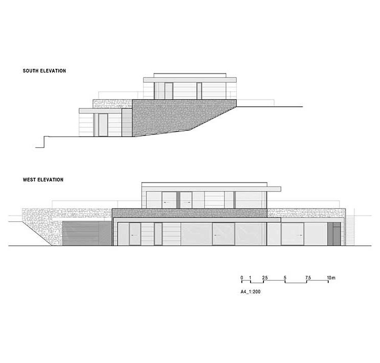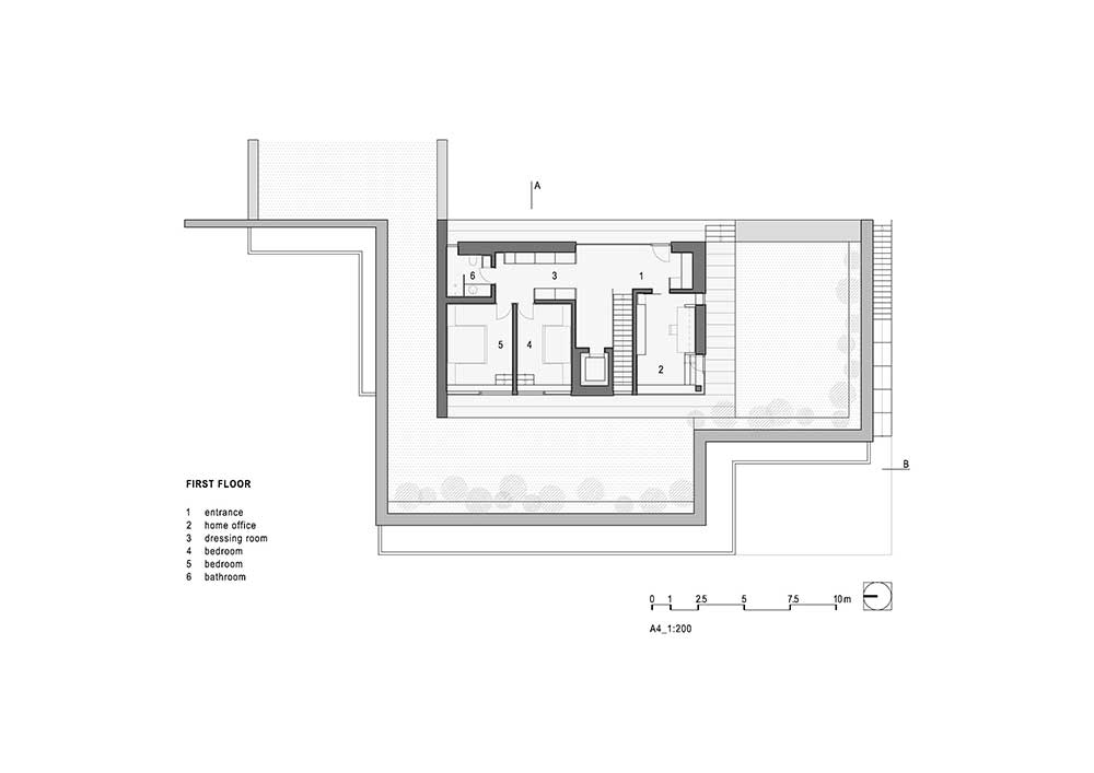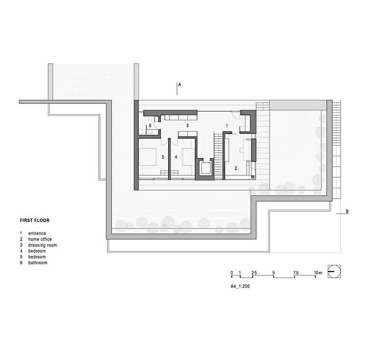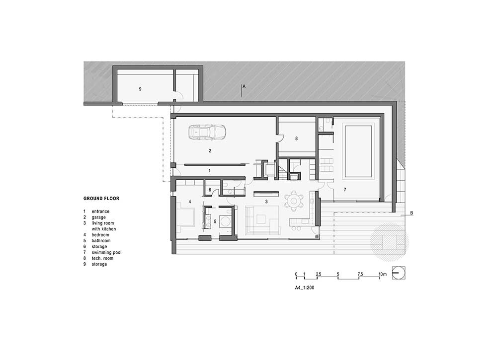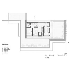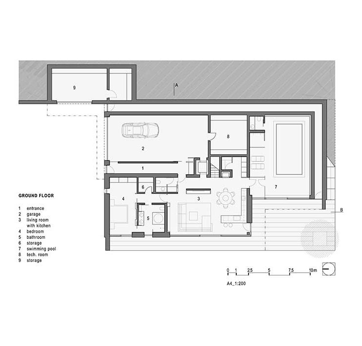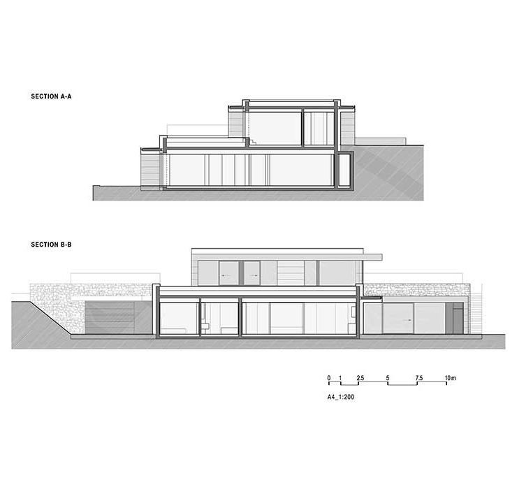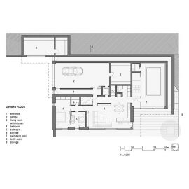 La villa si sviluppa su due piani: al livello superiore si trovano due camere per gli ospiti con ingresso separato e una stanza per lo studio e il lavoro da da casa. Il piano inferiore, parzialmente incassato nel terreno, contiene lo spazio abitativo principale compresi il garage e la piscina coperta.