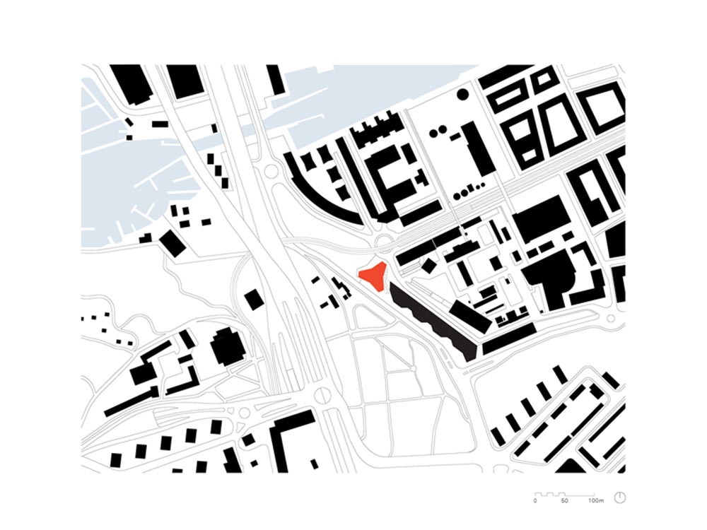 Situato lungo il bordo occidentale dell’area di riqualificazione, a sud dei ponti sul canale di Hammarby e accanto alla strada principale che conduce al centro cittadino, Stockholm One è progettato dallo studio tedesco Sauerbruch Hutton.