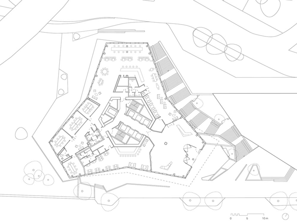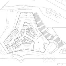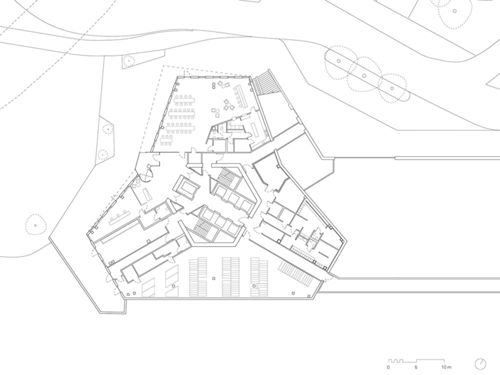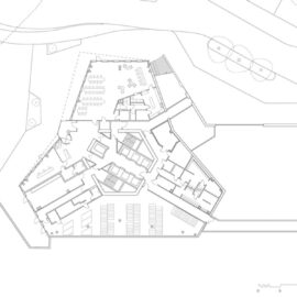 Insieme, questi due volumi distinti conciliano le diverse scale e le condizioni divergenti del contesto tra l’ampia arteria stradale, uno stretto parco a ovest e, a est, il nuovo quartiere cittadino che si trova circa 16 metri più in basso.