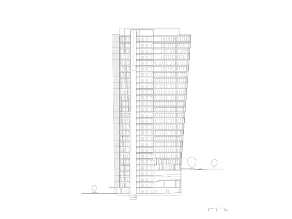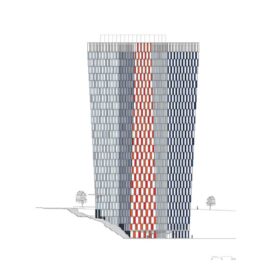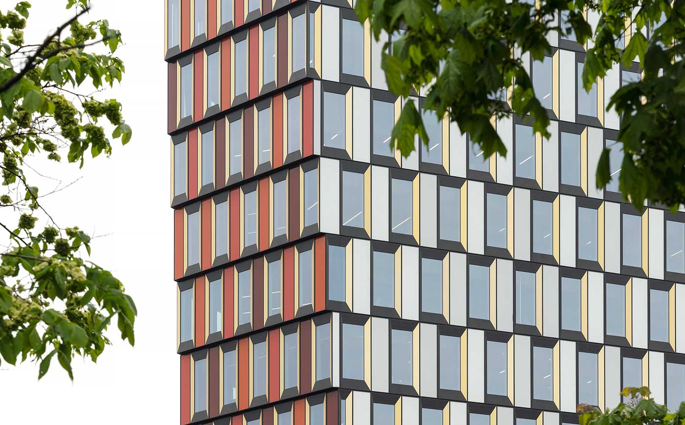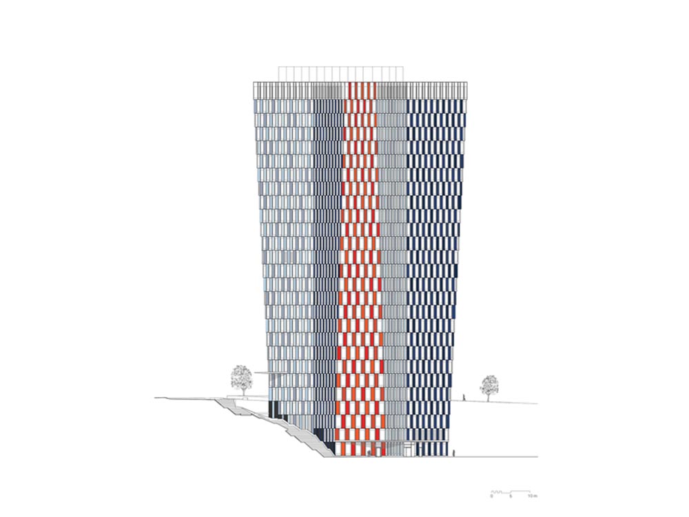 La facciata della torre, con la sua caratteristica policromia, tanto rappresentativa della progettualità di Sauerbruch Hutton, dà identità al nuovo quartiere di cui diventa un nuovo landmark.
