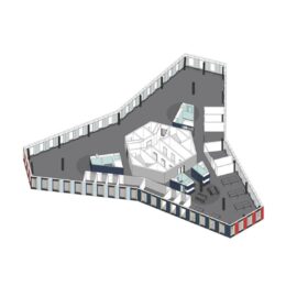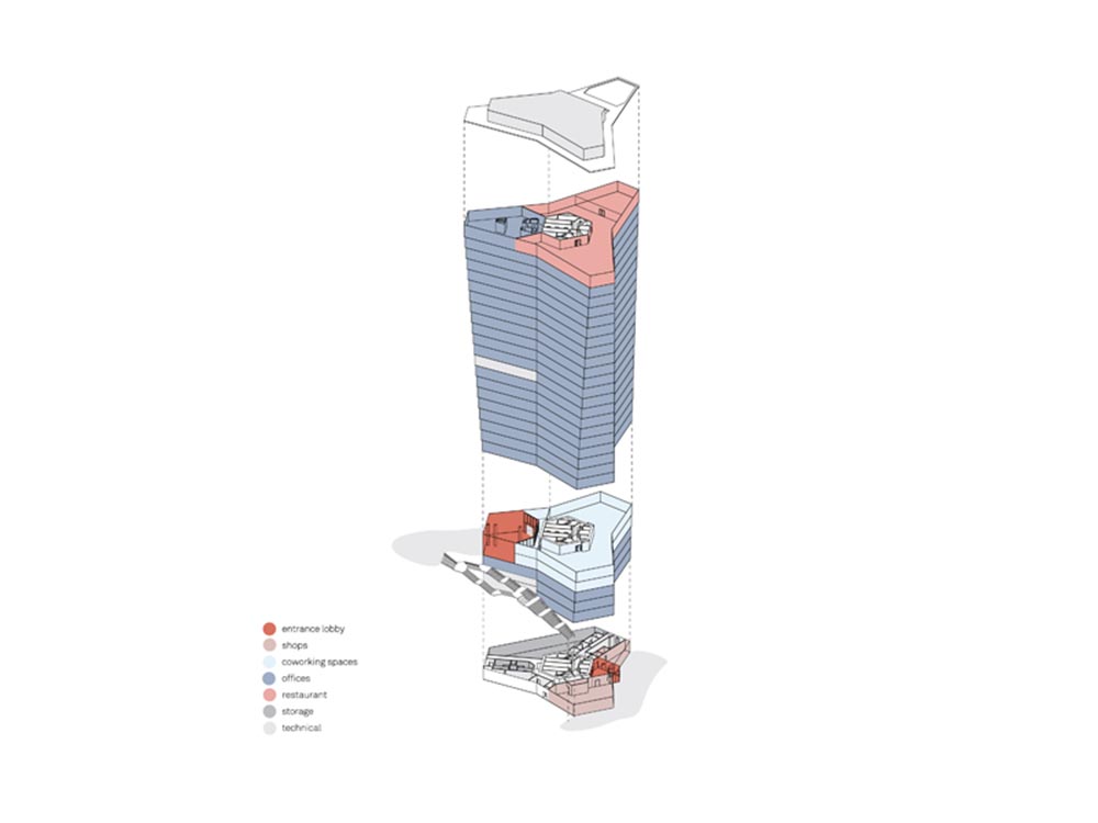 Sui due diversi livelli del terreno sono poste alcune unità commerciali; all’ultimo livello del grattacielo un ristorante e uno sky bar beneficiano invece di una vista spettacolare sulla città.