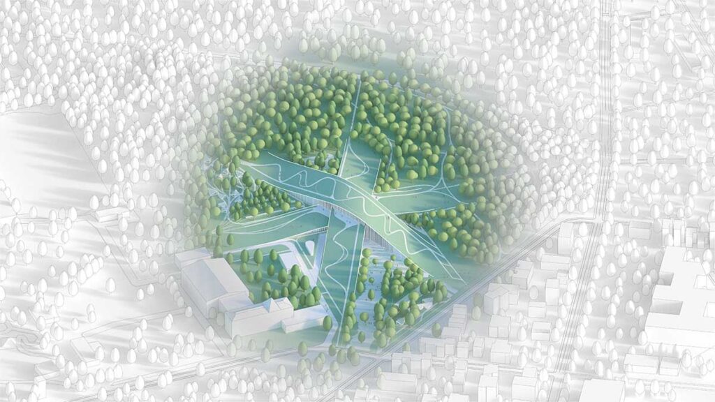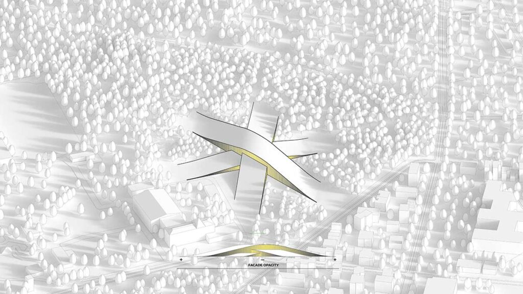 Il futuro museo si inserisce come un nuovo elemento naturale sul bordo tra la parte settentrionale della città e il grande parco forestale che la circonda: tre volumi curvi che si intersecano tra loro su livelli differenti, in parte incassati e in parte dolcemente emergenti dal bosco, con coperture vegetate con le stesse essenze forestali e percorsi che lo attraversano.