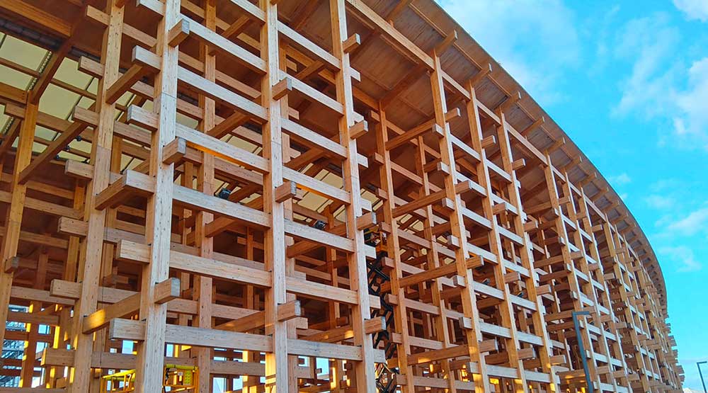 La tecnica costruttiva fonde metodi moderni per l’ingegnerizzazione del legno strutturale e metodi tradizionali giapponesi come il ‘nodo Nuki’ impiegato nella costruzione di templi come il celebre padiglione del tempio di Kiyomizu a Kyoto.
