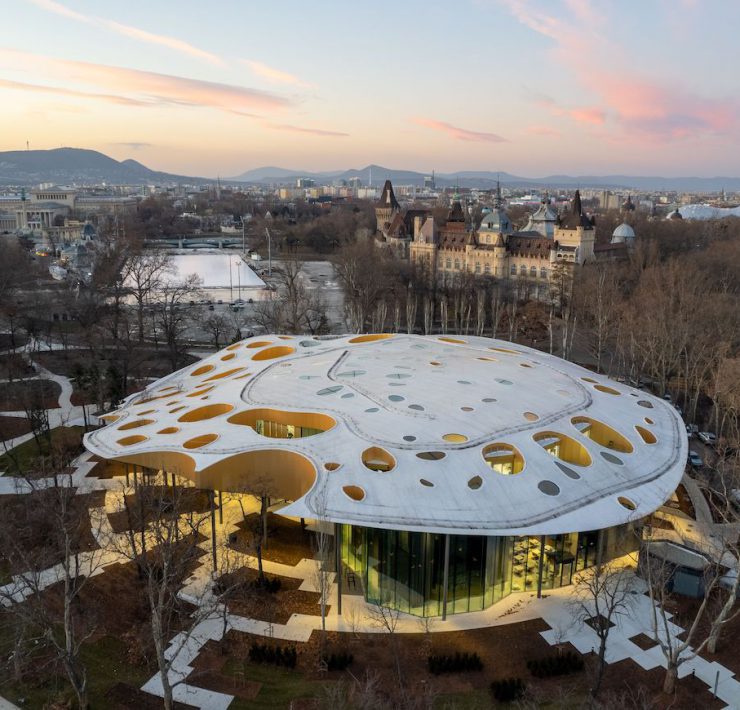 Alto 20 metri, il tetto del padiglione è coperto di verde e fiori e accoglie una piattaforma panoramica accessibile ai visitatori.