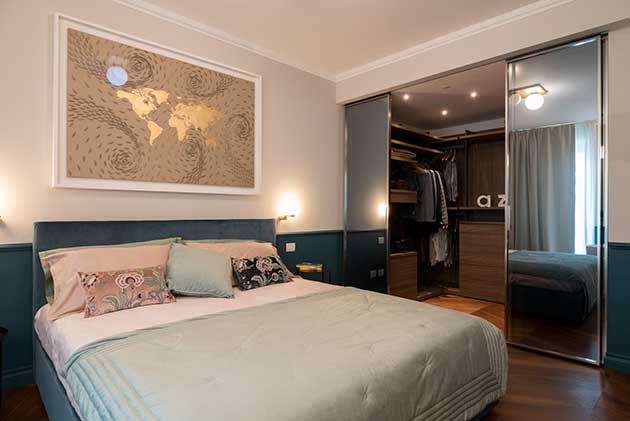 Grande attenzione è stata dedicata all’illuminazione: i faretti minimal in cucina, nel disimpegno, nel bagno en suite e nella cabina armadio creano un’illuminazione diffusa. Eleganti chandelier in vetro e cristallo e applique dal fascino retrò, invece, compongono l’arredo luci decorativo.
