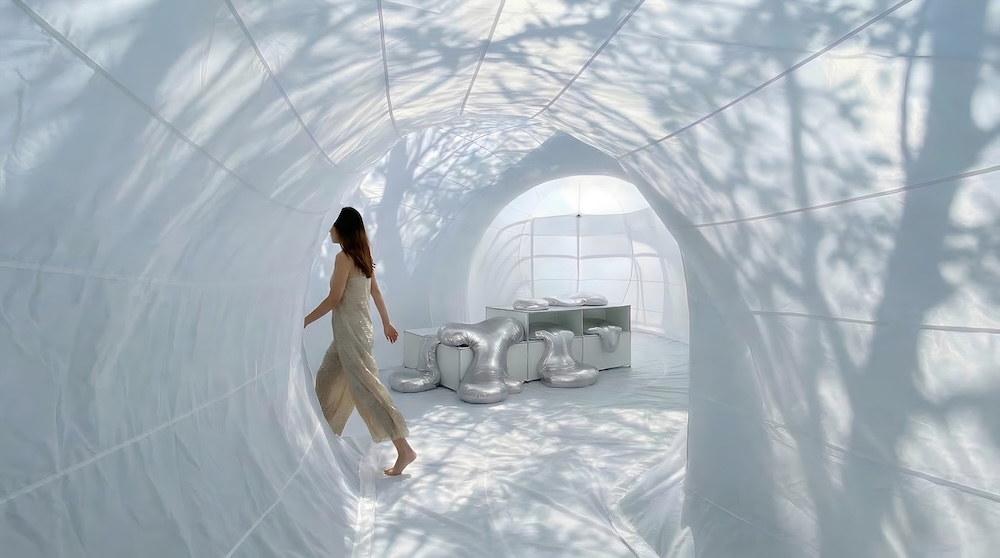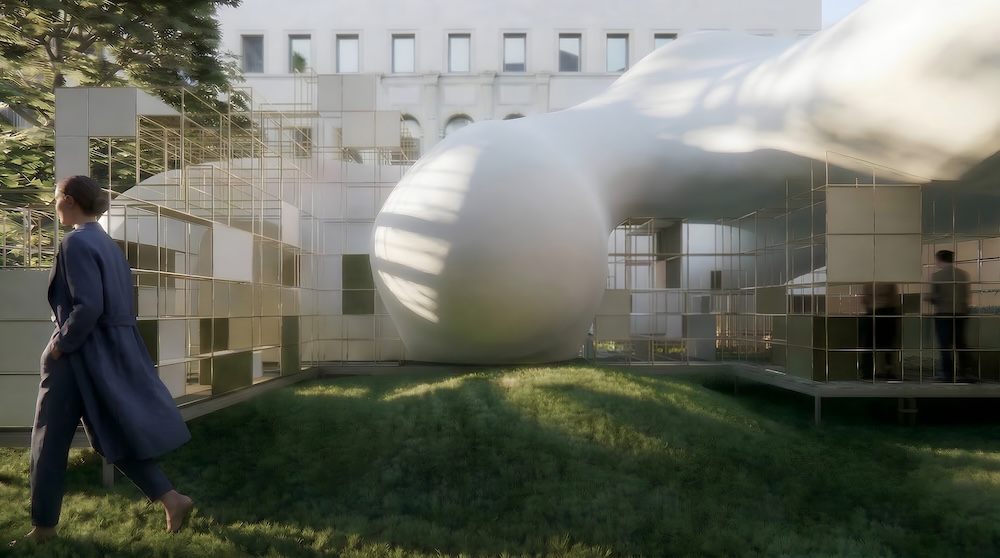 Il progetto prende forma a partire dal sistema modulare USM Haller, qui usato come struttura architettonica per sostenere una membrana tessile morbida e pulsante, simile a un bozzolo. Il contrasto tra la griglia in acciaio e l’involucro organico definisce un ambiente sospeso tra precisione costruttiva e vulnerabilità, mentre l’intervento di Snøhetta costruisce una sequenza pensata insieme come presenza scultorea nel giardino del museo e come rifugio raccolto.