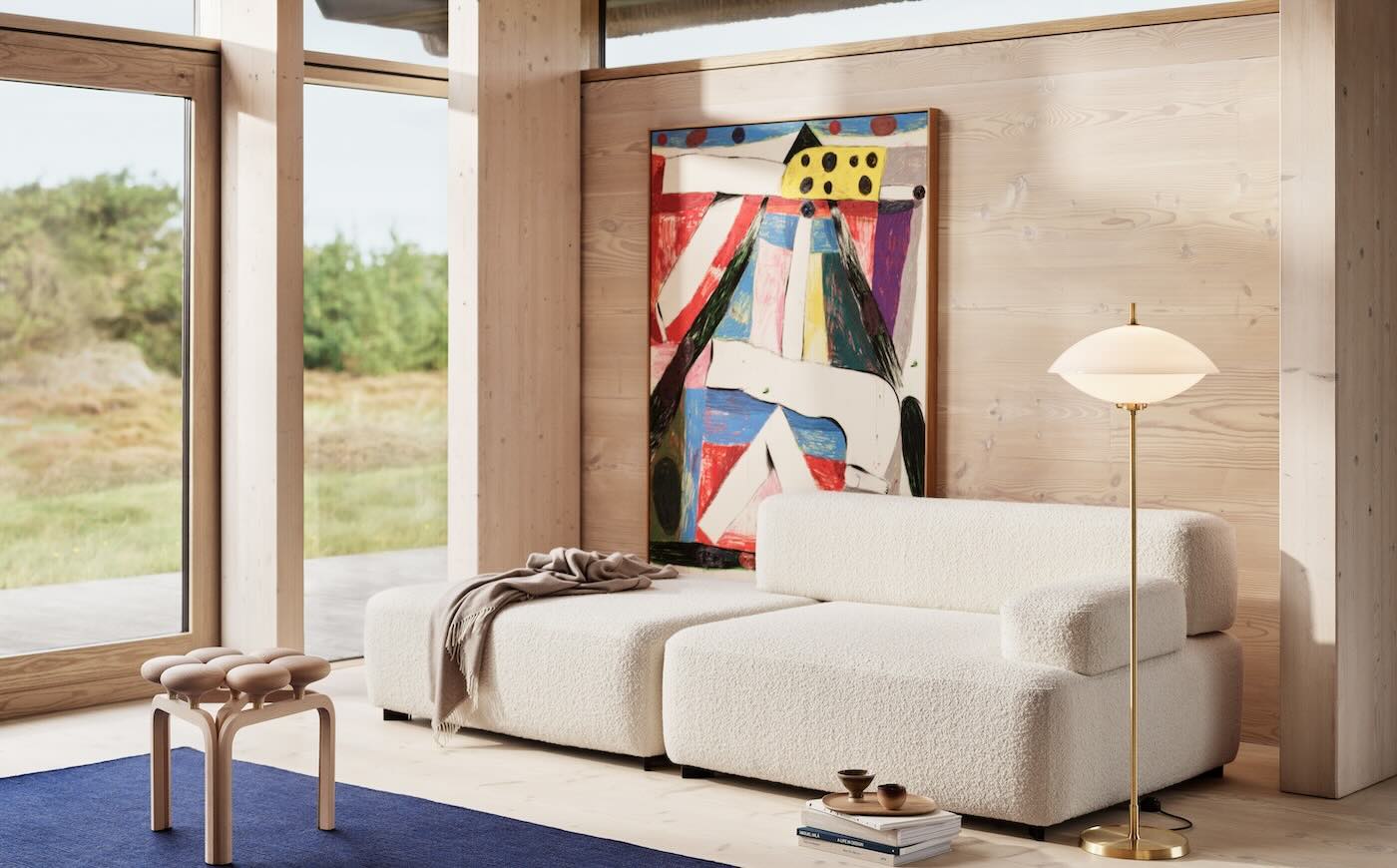 Le nuove versioni da tavolo e da terra della lampada Clam sono realizzate con lo stesso ottone spazzolato e vetro opalino della originaria versione a sospensione. Qui con il divano Alphabet di Piero Lissoni in tessuto bouclé di Dedar.