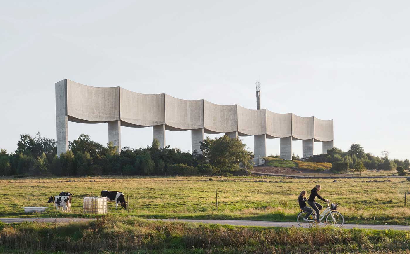 E in effetti il progetto dello studio White Arkitekter che ha vinto il concorso di progettazione indetto da Vivab, la società che gestisce il ciclo idrico della città di Varberg, sulla costa occidentale della Svezia, è unica nel suo genere. Lunga 187 metri ma larga solo 9, Våga è una sequenza di otto segmenti concavi di calcestruzzo retti da nove possenti pilastri, quello centrale che contiene scale e ascensori, che si staglia orgogliosamente nel paesaggio rurale di Träslöv, a est del centro di Varberg, ben visibile dalla vicina autostrada E6.
