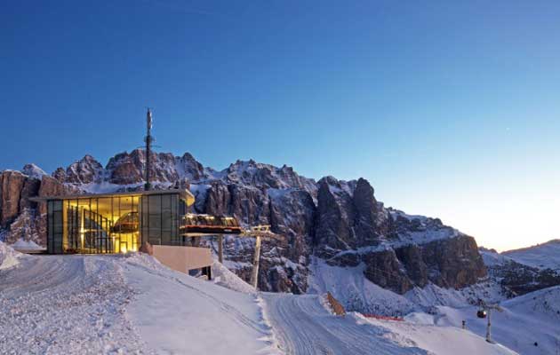 Sviluppate a tutta altezza, le ampie pareti vetrate alleggeriscono le masse degli edifici senza marcare la propria origine tecnologica. Oltre a minimizzare l´impatto edilizio in un ambiente altrimenti incontaminato, la permeabilità visiva delle vetrature stabilisce nuovi dialoghi tra il sistema di risalita, l’opera dell’uomo e i panorami delle Dolomiti.