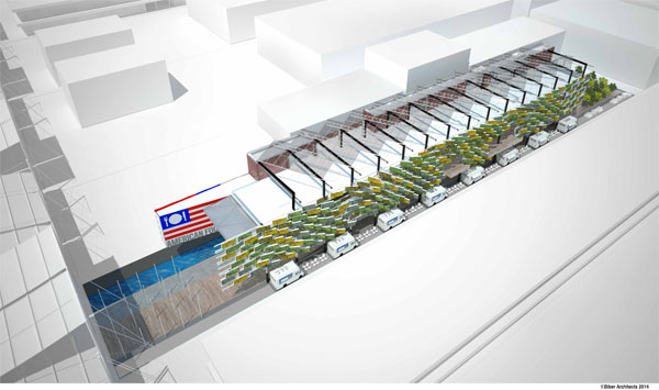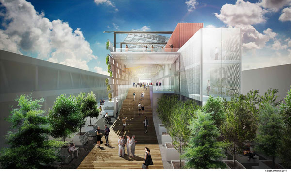 Ripensando totalmente la tradizionale “chiusura” dei padiglioni americani (come a Shangai) American Food 2.0 –questo il nome del padiglione, disegnato dallo studio Biber Architects di New York- accoglierà i visitatori con un portale a tutta altezza aperto sul decumano, e una passerella costruita riutilizzando listoni di legno utilizzati su spiagge e pontili americani li condurrà lungo il percorso interno fino al piano superiore e alla terrazza vetrata in copertura.