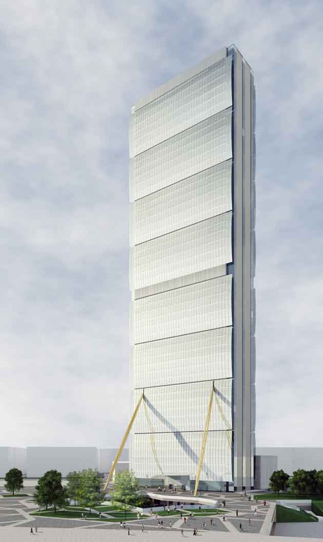 Il progetto soddisfa i prerequisiti di sostenibilità ambientale previsti dagli standard internazionali Leed, ed ha quindi già ottenuto la pre-certificazione Leed con rating Gold. Il cantiere avviato nei mesi scorsi presenta caratteristiche fisiche e tecnologiche di portata considerevole. La platea di fondazione ha previsto un getto continuo di calcestruzzo per un totale di 4.260 metri cubi, operazione che ha avuto una durata di ben 42 ore di lavoro senza soluzione di continuità. L’armatura della platea di base è stata realizzata con barre di acciaio per un peso totale di circa 1.200 tonnellate e una dimensione in pianta di circa 63 per 27 metri, con 62 pali di sottofondazione in cemento armato aventi una lunghezza di oltre 30 metri. Le azioni del programma dei lavori di cantiere sono strettamente connesse le une alle altre: una volta realizzate le strutture, man mano che i piani si libereranno dalle impalcature temporanee verranno assemblate le facciate.
