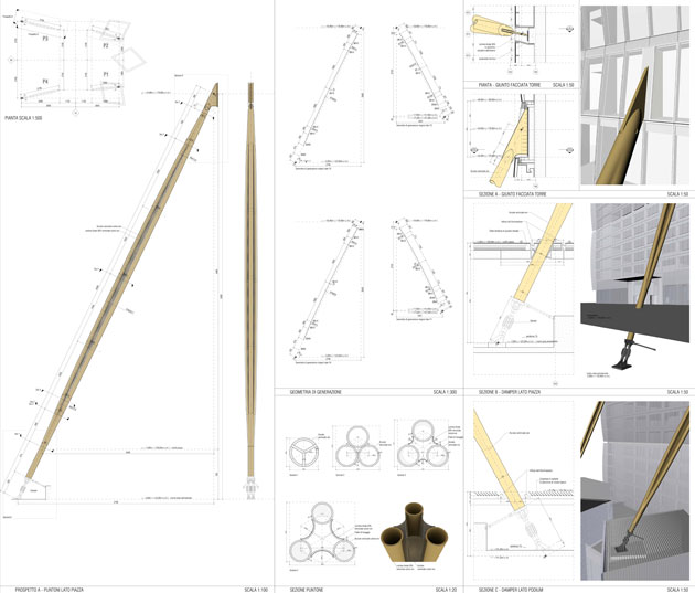 | Piante, prospetti, sezioni e dettagli dei puntoni gialli in acciaio collocati in posizione inclinata sui prospetti principali della Torre |