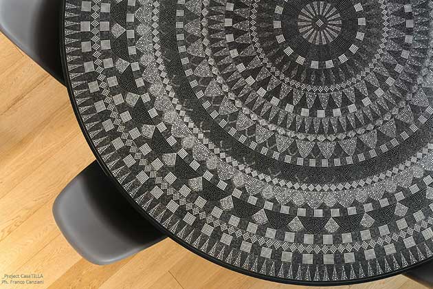 Mutaforma, un micromosaico in vetro riveste il piano di un tavolo a Casa Tilla