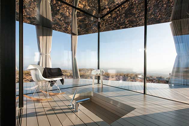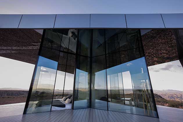 Collocata su un basamento in legno interamente rivestito in vetro specchiante Guardian, la Casa del Deserto è completamente autonoma dalle reti in quanto dotata di un sistema di filtrazione dell’acqua e di pannelli fotovoltaici per la produzione di energia elettrica.