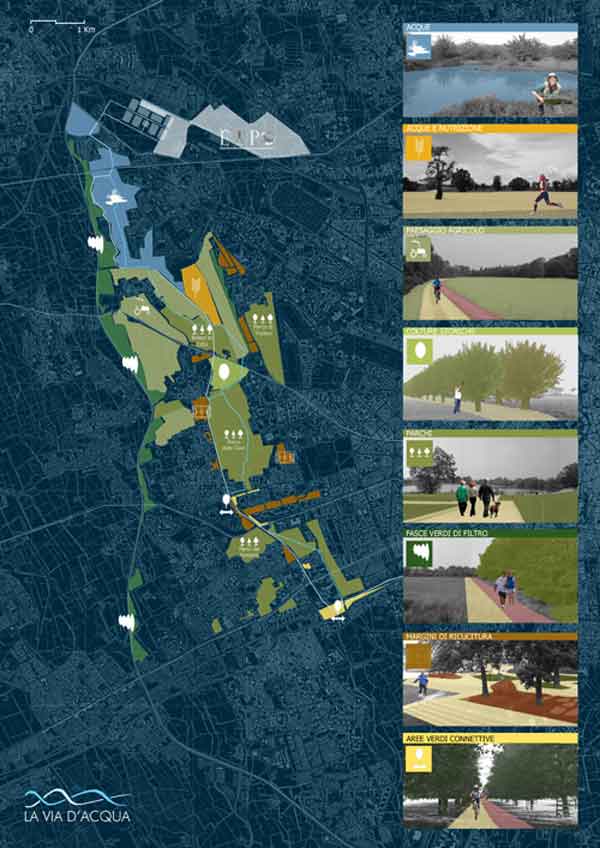 La Via d´acqua opera una ?ricucitura paesistica? che, attraverso interventi puntuali e mirati potrá configurare radicalmente un margine metropolitano riordinando le attuali situazioni di criticitá. Si potrá cosí avviare la ricomposizione dell´attuale frammentazione esistente tra i luoghi che compongono il quadro urbano riordinando il rapporto tra aree urbanizzate e aree verdi di corona urbana. Queste ultime, una volta riqualificate, parteciperanno con un importante ruolo di riequilibrio ambientale al futuro disegno della cittá.