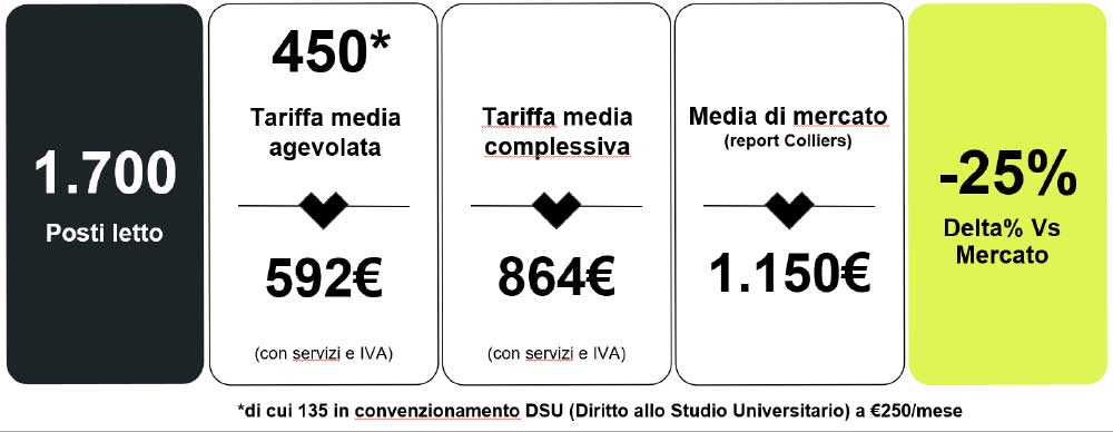 Le tariffe, tutte convenzionate, sono differenziate in funzione della tipologia di stanza (singola o doppia) e includono l’IVA e tutti i servizi legati a sicurezza, comfort e socialità. La tariffa media complessiva di 864 euro al mese è del 25% inferiore alla media di mercato milanese riferita alle locazioni comprensive di servizi (1.150 euro al mese). Inoltre, grazie ai contributi del Fondo Nazionale dell’Abitare Sociale (Fnas) di Cdp Real Asset e del Ministero dell’Università e Ricerca, i posti letto a tariffa agevolata sono stati triplicati rispetto alla quota iniziale, raggiungendo 450 unità con un costo medio a posto letto di 592 euro al mese (IVA e servizi inclusi), di cui il 30% (pari a 135 posti letto) destinato al Diritto allo Studio (DSU), al costo di circa 250 euro/mese. Per l’accesso ai posti letto a tariffa agevolata ordinaria è richiesta la certificazione ISEE inferiore a 44 mila euro/anno; per i posti letto DSU saranno applicati dagli atenei pubblici i criteri specificamente previsti per questa tipologia di posti letto.