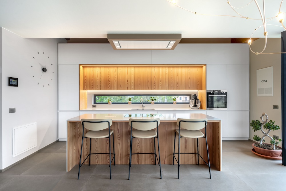All’interno di questo impianto progettuale, la componente tecnologica è pensata come parte integrante dell’architettura. La casa è dotata del sistema domotico By-me Plus di Vimar, che consente la gestione coordinata di illuminazione, clima, automazioni per tende e tapparelle, monitoraggio dei consumi elettrici e controllo dei carichi dei singoli elettrodomestici. L’obiettivo è ottimizzare il funzionamento dell’edificio e ridurre gli sprechi energetici, mantenendo un’interfaccia intuitiva e accessibile anche da remoto tramite l’app View.