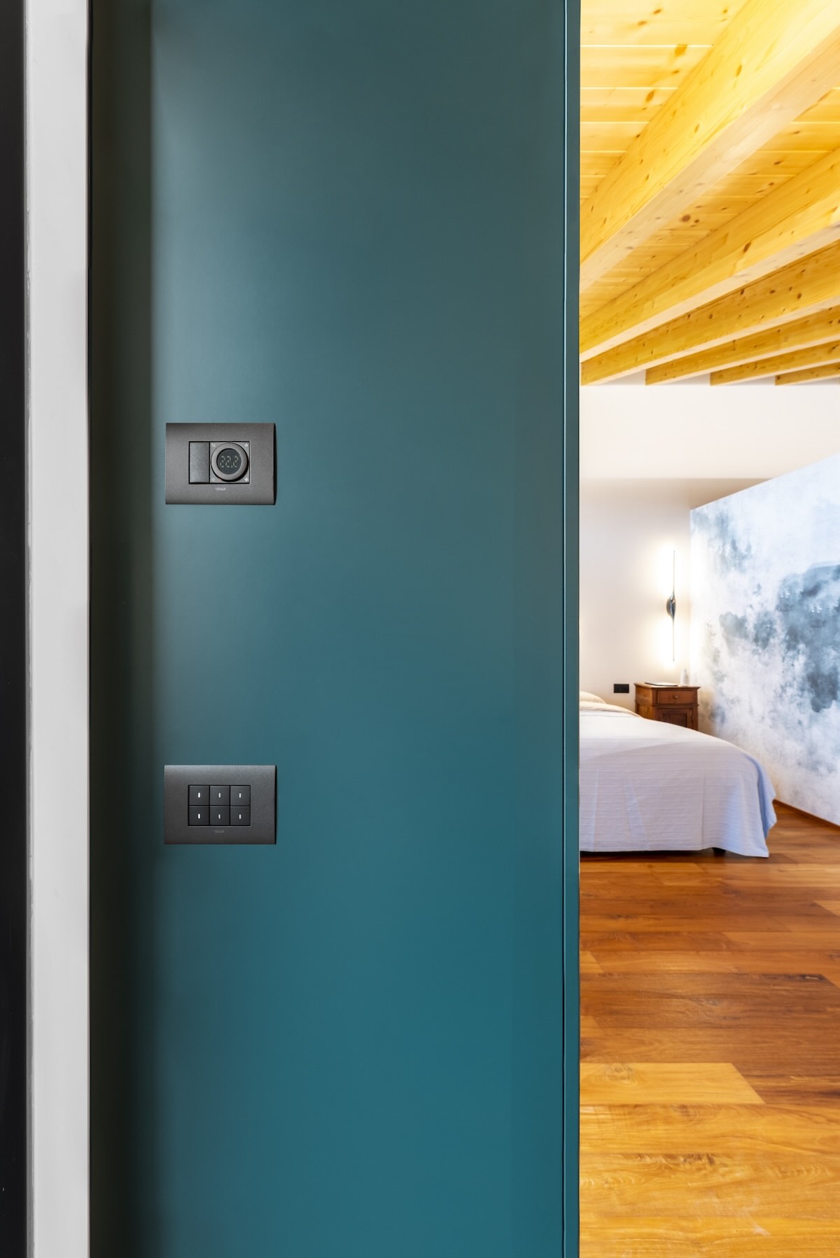 La tecnologia dialoga con l’estetica attraverso la serie civile Arké fit, scelta nelle finiture grigio metal e nero per il suo disegno sottile e planare. I comandi si inseriscono in modo discreto sulle superfici murarie, contribuendo alla pulizia visiva degli ambienti senza rinunciare alla funzionalità.