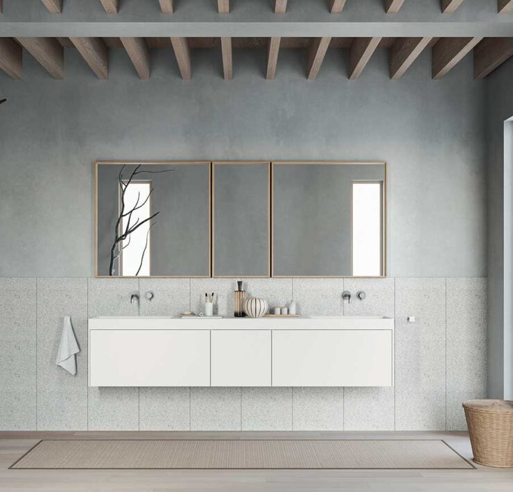 Con architetture monolitiche dall’effetto scenografico realizzabili scegliendo tra molteplici dimensioni e una ricca gamma di finiture e materiali (tra cui gres, legno, Fenix, Eco.malta e Corian), Vision trasforma la parete in un contenitore verticale di funzioni, integrando i lavabi, che diventano ‘fonti’ disegnate per portare alla luce il mondo dell’acqua e dei suoi rituali, e celando vani tecnici attrezzati e personalizzabili con accessori, vaschette, prese elettriche, porta phon − per offrire il massimo della funzionalità e della flessibilità con un’estetica essenziale ed elegante.