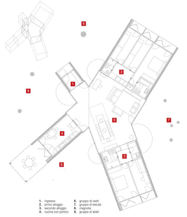 Inserita nel parco di un residence anni ’60 in Brianza, una costruzione lineare dalla pianta ramificata si apre alla natura circostante e raccorda due distinti nuclei abitativi attorno a uno spazio comune. Il progetto affidato allo studio di architettura Liverani/Molteni doveva rispondere a pochi ma essenziali punti fermi. Innanzitutto, l’impianto dell’edificio doveva essere semplice e flessibile per conciliare le diverse esigenze degli abitanti – un regista e la famiglia di sua sorella, madre di tre bambini. Inoltre, in quanto seconda casa per soggiorni saltuari, avrebbe dovuto richiedere poca manutenzione e le spese di costruzione non dovevano superare un budget di 500mila euro. La struttura in cemento armato con piscina, distribuita su un unico piano, presenta una pianta a stella irregolare con un ambiente centrale comune che raccorda le camere raggruppate in due corpi separati, la cucina con portico e la zona dell’ingresso.