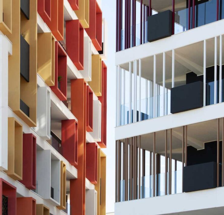 Una griglia a geometria irregolare caratterizza il prospetto di accesso, convesso, rivolto a est. Spazi vuoti si alternano a superfici di lamiera macroforata sui toni del grigio, del bianco e del verde, con una composizione geometrica di cromatismi che richiama alla mente i quadri di Mondrian. Il fronte concavo opposto, a ovest, presenta un andamento regolare, scandito dagli allineamenti orizzontali dei solai e dalle linee verticali delle griglie di separazione tra gli alloggi. Fioriere collocate sui parapetti in vetro delle terrazze richiamano le note di colore del fronte est.