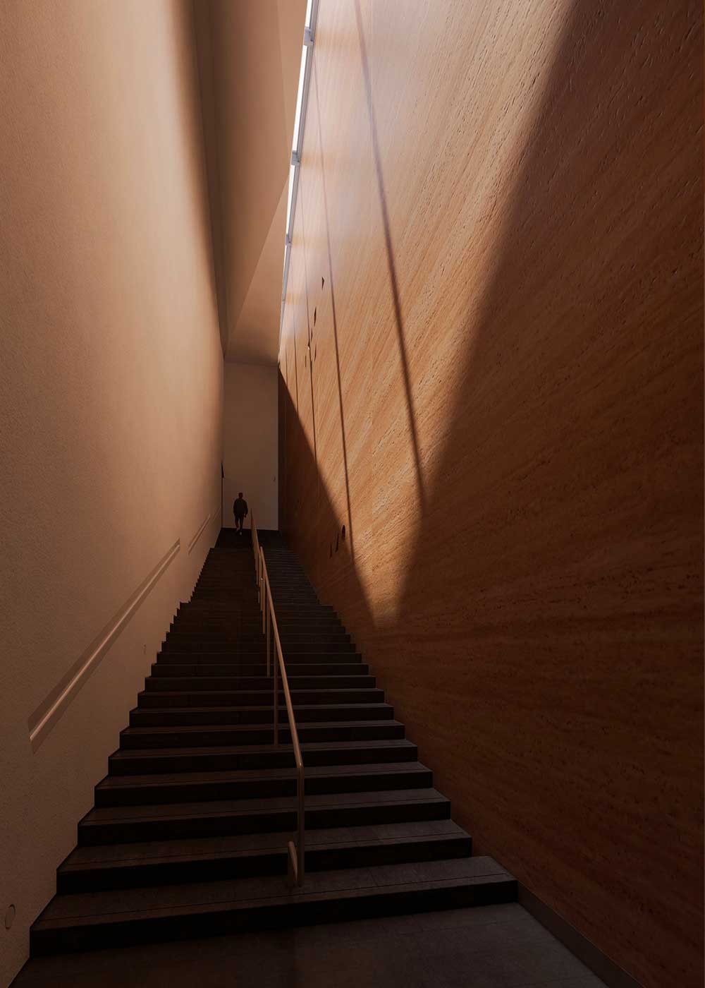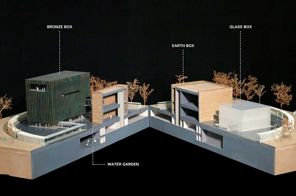 Insieme, i tre volumi ospitano le principali funzioni pubbliche: ingresso, spazi espositivi, laboratorio, ristorante e shop. Sotto la superficie dell’acqua, gli spazi sono collegati in un unico ambiente che comprende un teatro multifunzionale, sala prove, caffetteria, uffici e servizi. Questa configurazione offre un’esperienza ricca e multidimensionale, mantenendo al contempo la purezza poetica dell’architettura in superficie.