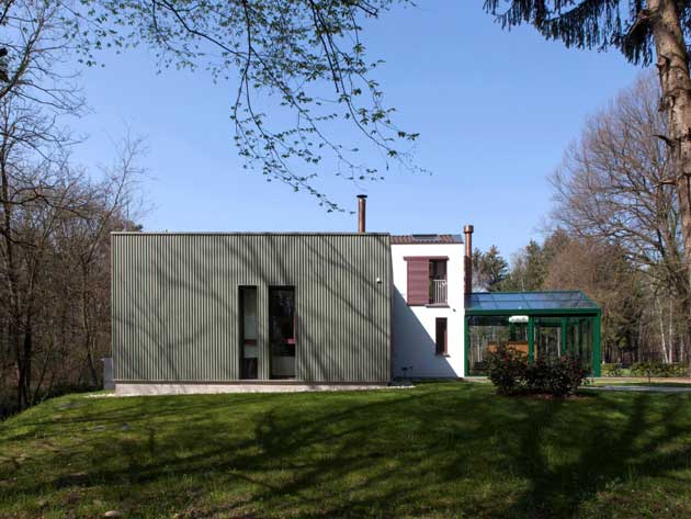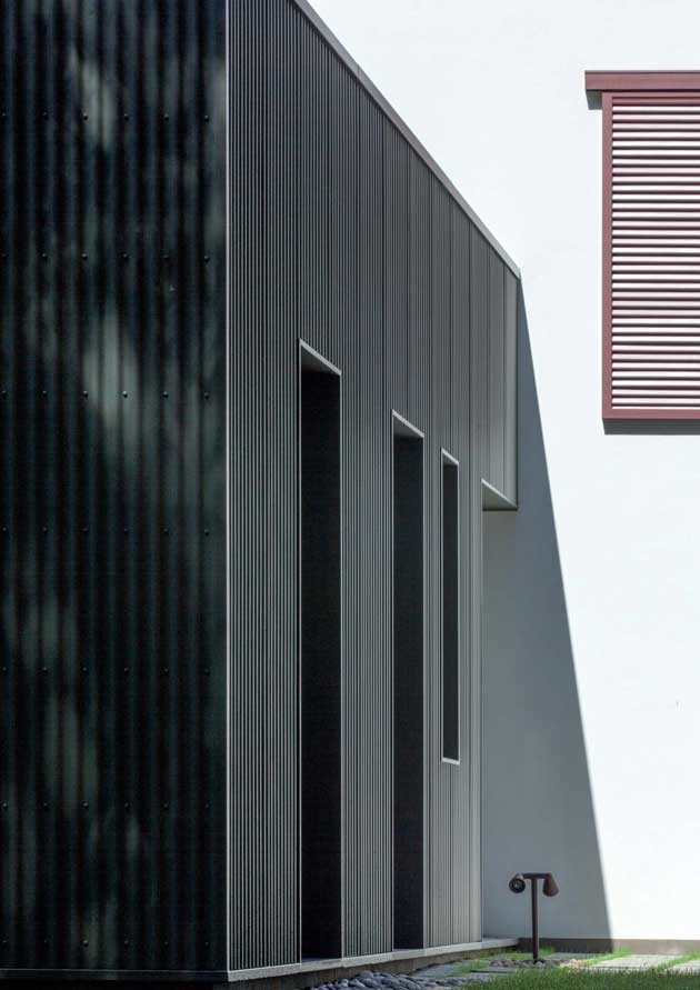 La facciata ventilata del nuovo corpo basso con tetto piano, rivestita con pannelli ondulati in zinco titanio pigmentato in colore verde lichene posati in verticale, dialoga piacevolmente con il più tradizionale volume a due livelli, in muratura portante protetta da isolamento termo-acustico, intonacata e con copertura a due falde, dell’abitazione principale.