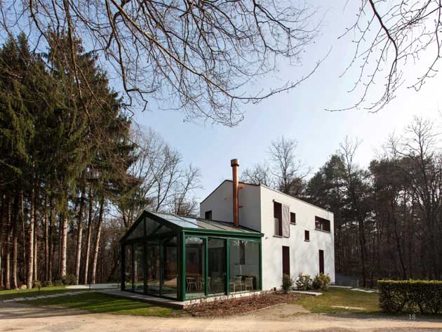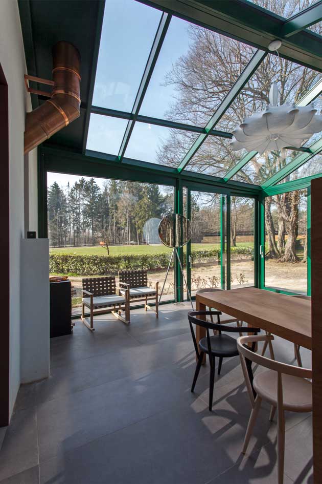 Se la relazione con l’esterno è dettata dal verde e dal bosco che contornano l’edificio, la luce naturale caratterizza gli spazi interni, a cominciare dalla veranda vetrata estensione dell’ambiente di soggiorno (dove è stato collocato un camino bifacciale passante) per proseguire con i lucernari in legno di pino comandati elettricamente al piano superiore, protetti da tende filtranti all’interno e persiane esterne.