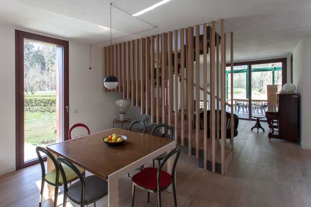 La scala che nel corpo principale conduce al primo livello e da qui al terrazzo, con struttura in ferro e doghe verticali in legno che richiamano i motivi di trasparenza creati dai tronchi degli alberi del vicino bosco, è elemento centrale e leggero dello spazio di soggiorno.