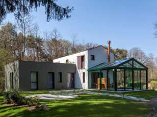La facciata ventilata del nuovo corpo basso con tetto piano, rivestita con pannelli ondulati in zinco titanio pigmentato in colore verde lichene posati in verticale, dialoga piacevolmente con il più tradizionale volume a due livelli, in muratura portante protetta da isolamento termo-acustico, intonacata e con copertura a due falde, dell’abitazione principale.