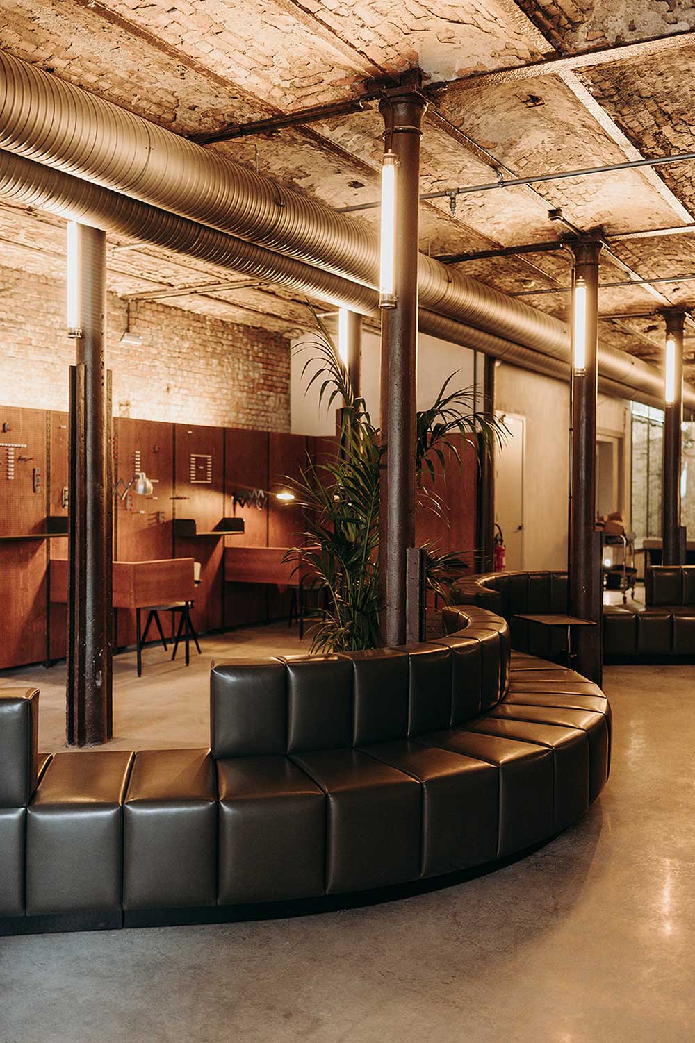 Il Wintercircus ospita anche due spazi dedicati alla ristorazione: al primo piano un ristorante di sushi e al piano terra un bar che combina elementi contemporanei, come acciaio e cemento, con materiali caldi e illuminazione soffusa.