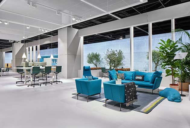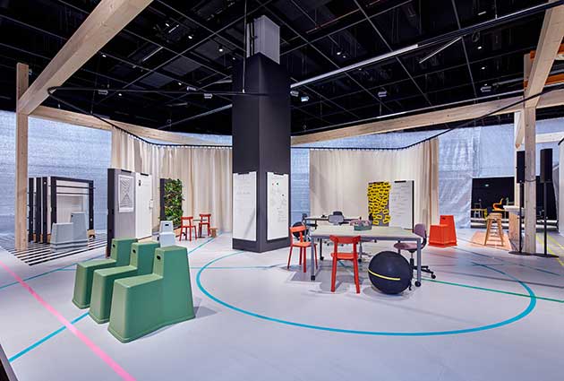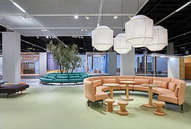 Infine, il designer britannico Sevil Peach ha ideato un allestimento formato dalla combinazione di elementi in cui trovano posto anche un parco urbano e una caffetteria, per affermare che oggi la sede aziendale moderna si estende oltre i confini tradizionali dell’ufficio per abbracciare il mondo urbano circostante.
