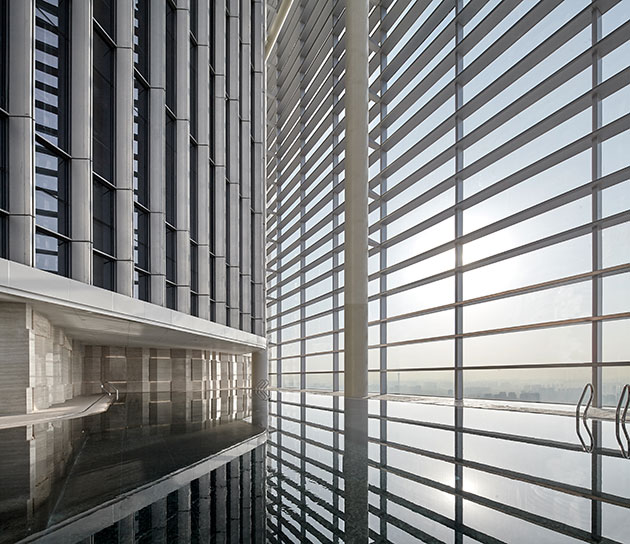 La piscina all´interno di una delle due torri e la vista sulla Zhengzhou |